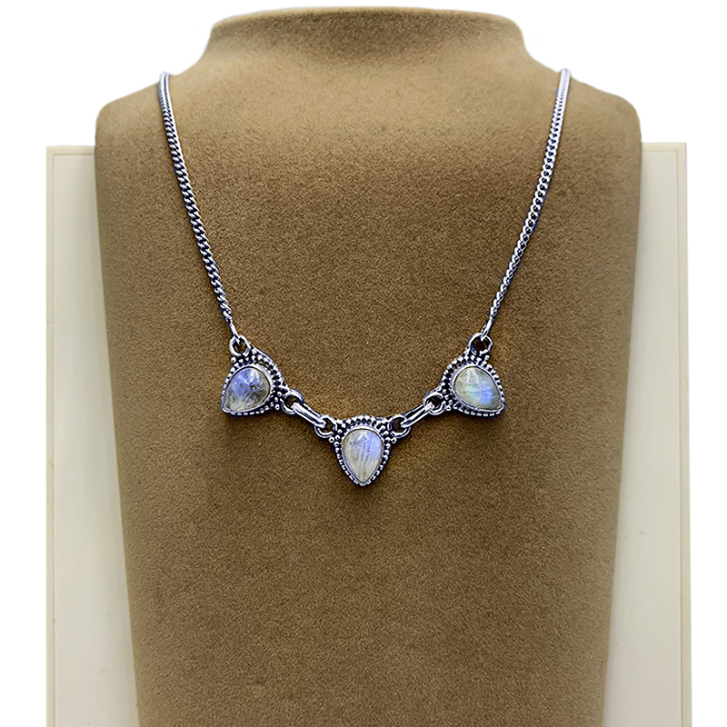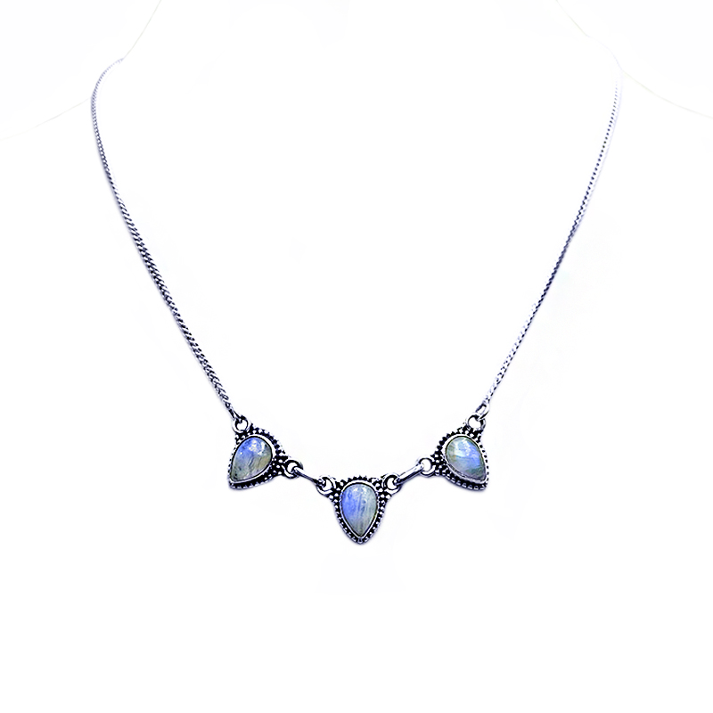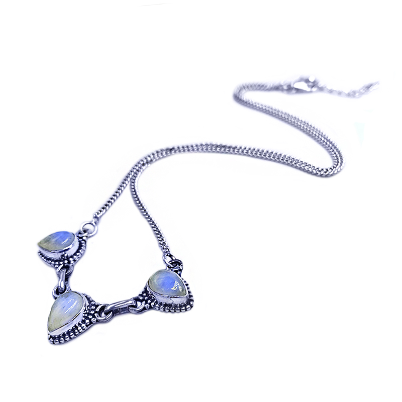 Χειροποίητο ασημένιο κολιέ με εξαιρετικής ποιότητας Φεγγαρόπετρα Χ3 (δάκρυ 0,9 Χ 0,7 cm).