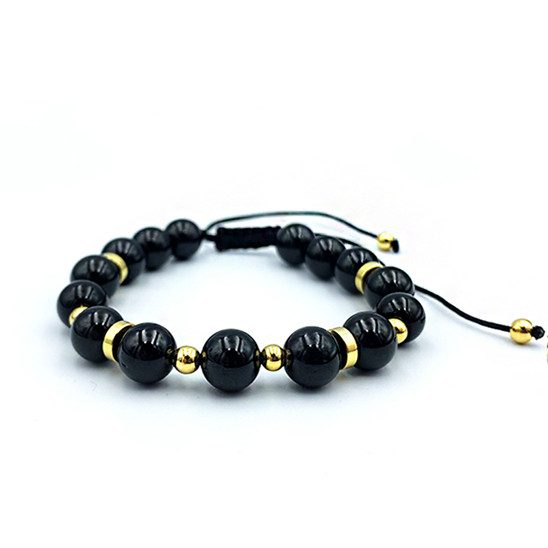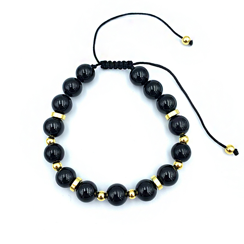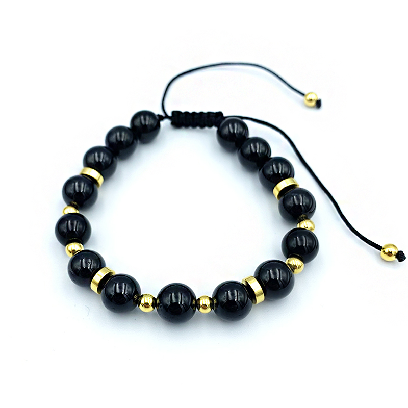 Βραχιόλι Macrame με Μαύρη Τουρμαλίνη 8mm και με στοιχεία από επιχρυσωμένο ορείχαλκο. Το βραχιόλι είναι κατασκευασμένο έτσι ώστε να αυξομειώνεται το μέγεθός του!