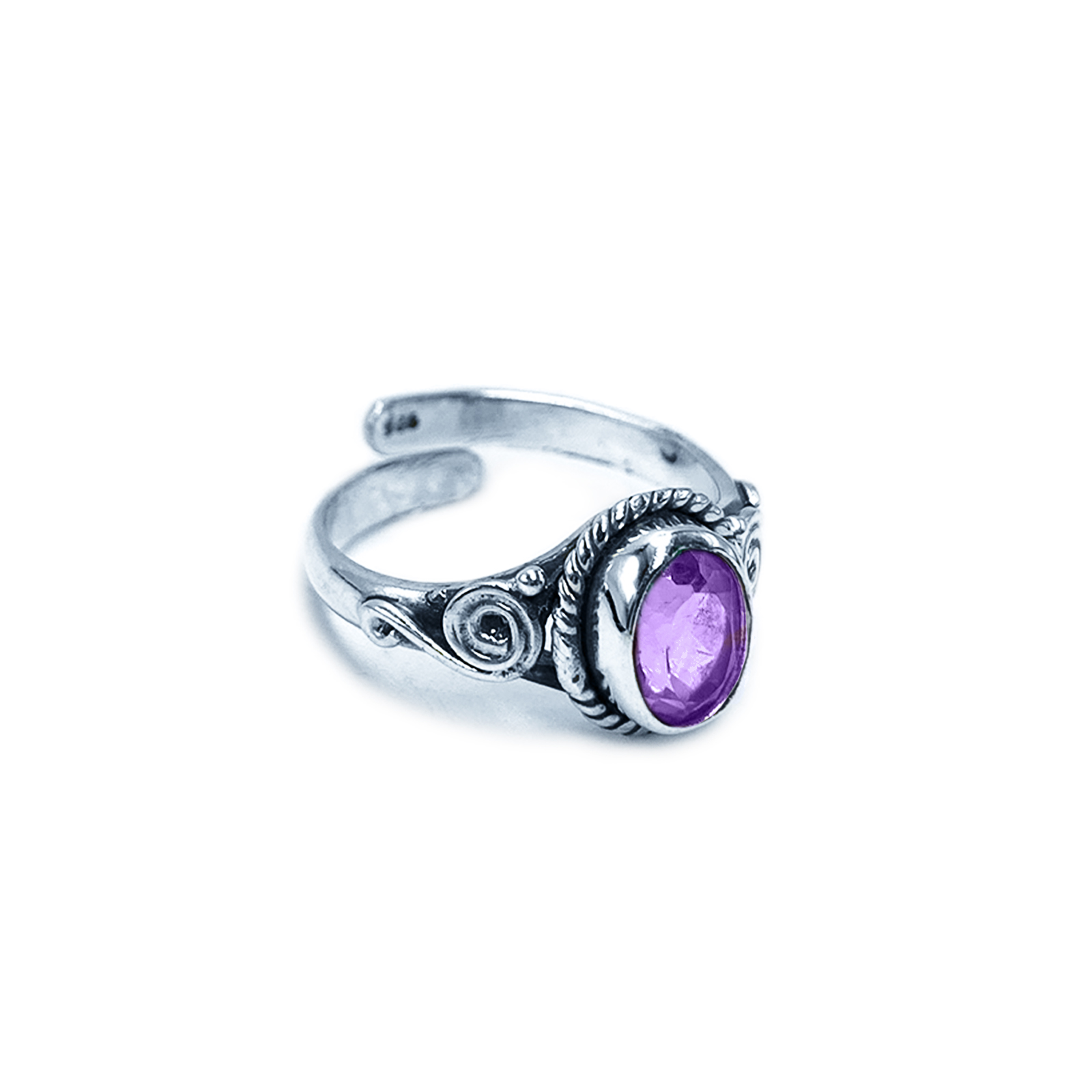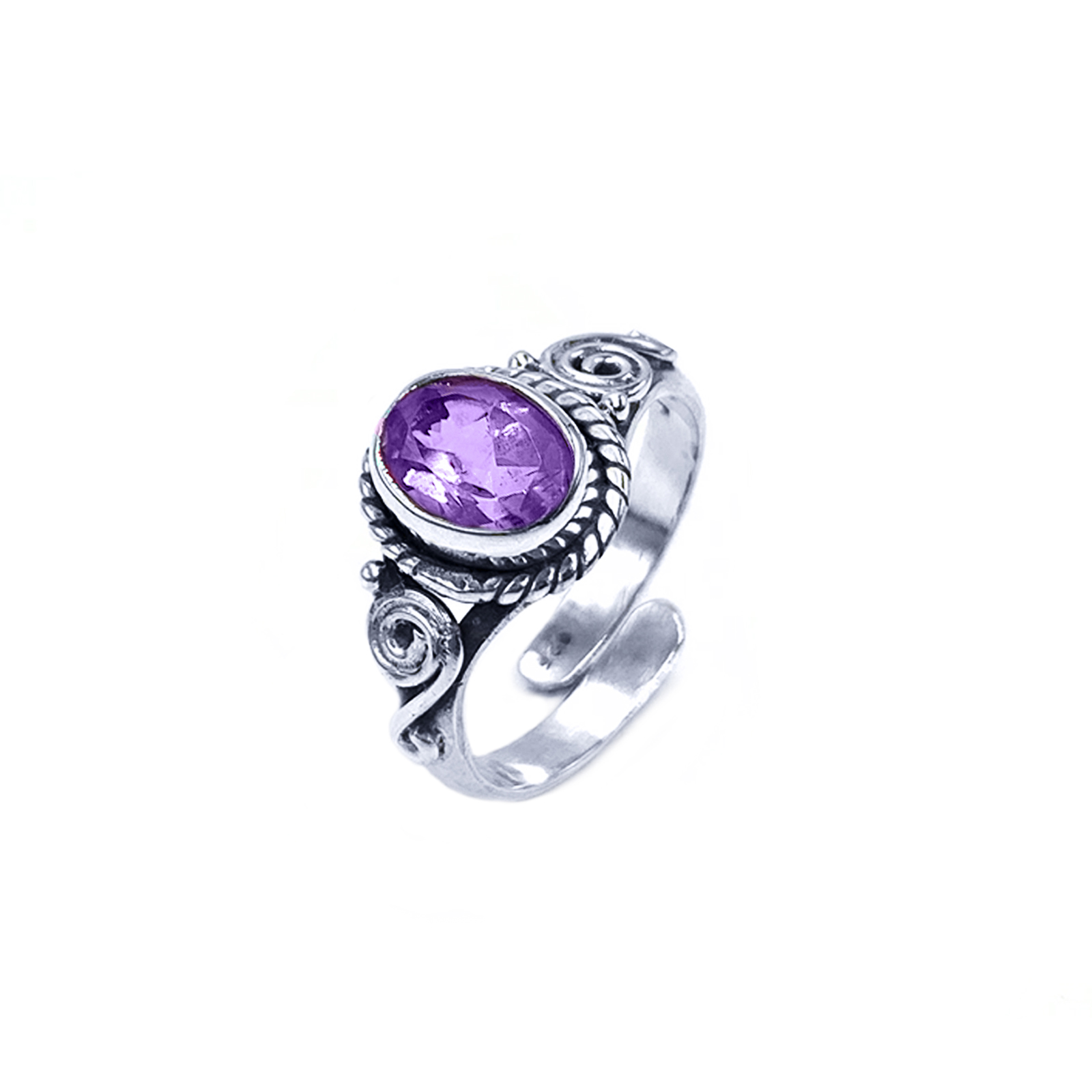 Χειροποίητο ασημένιο δαχτυλίδι Αμέθυστος (οβάλ – ταγέ 0,9 Χ 0,7cm) και με ανοιχτή γάμπα για να αυξομειώνεται το μέγεθος.