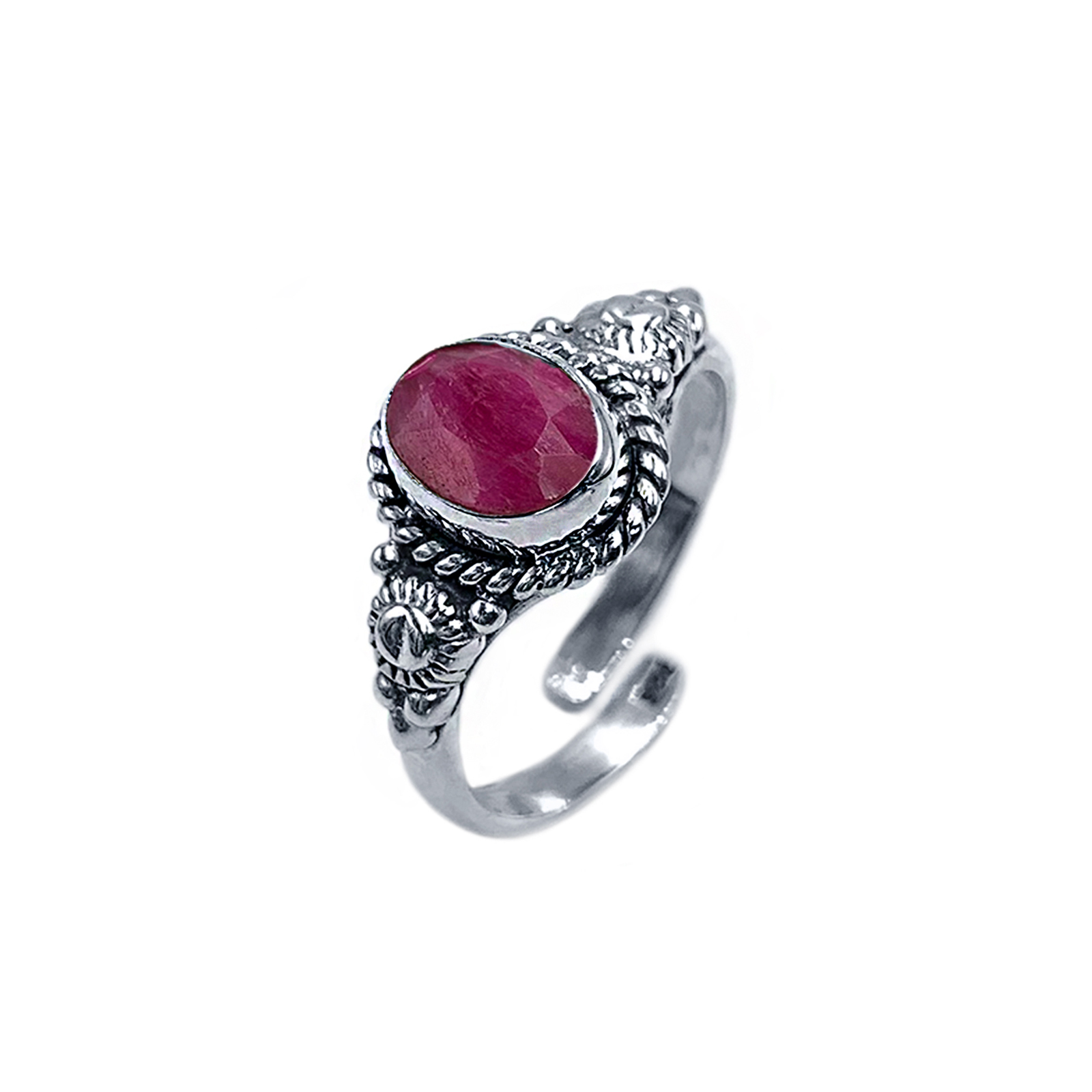Χειροποίητο ασημένιο δαχτυλίδι με Ρουμπίνι (οβάλ ταγέ 0,9 Χ 0,7cm.) και με ανοιχτή γάμπα για να αυξομειώνεται το μέγεθος.