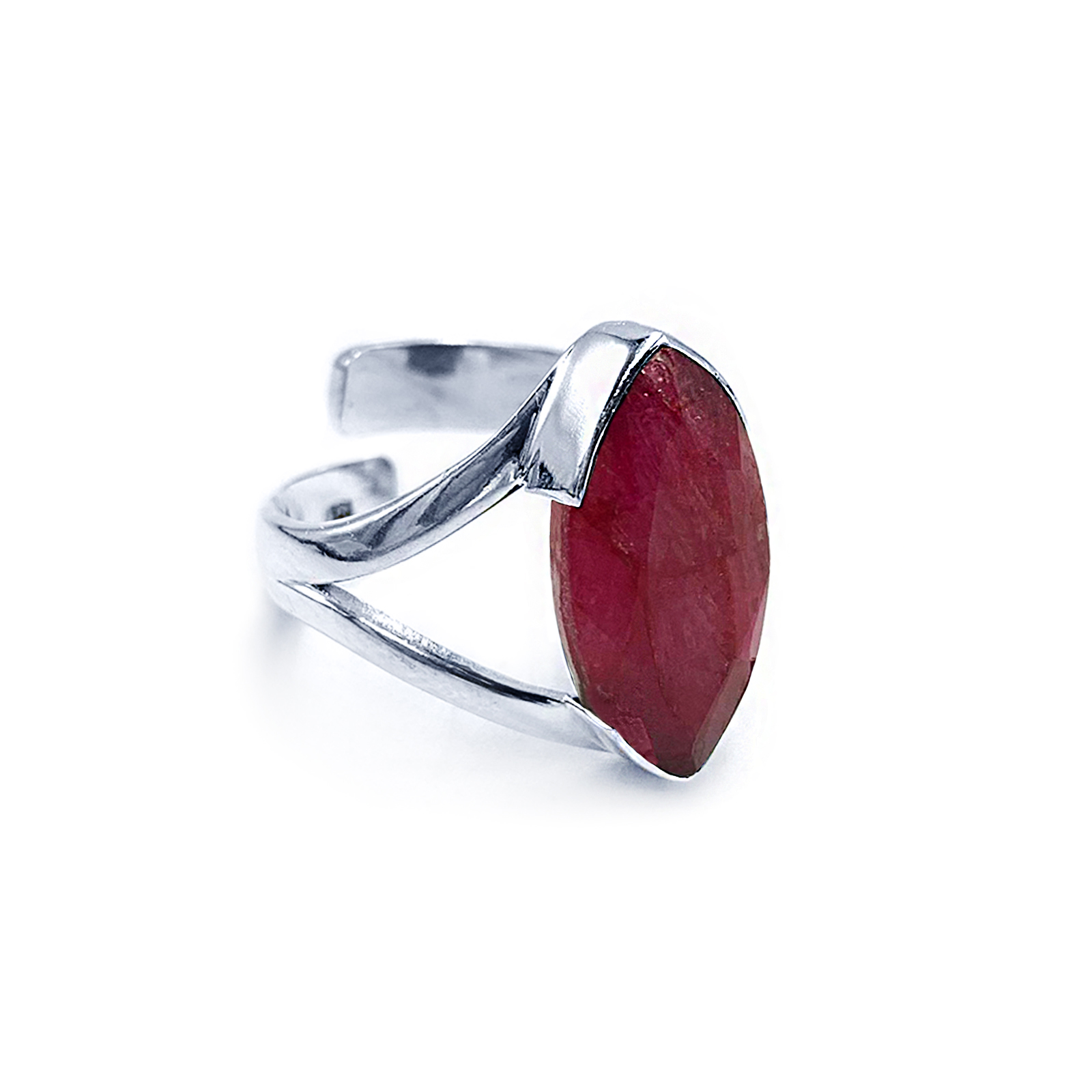 Χειροποίητο ασημένιο δαχτυλίδι με Ρουμπίνι (ναβέτα 2,0 Χ 1,0cm.) και με ανοιχτή γάμπα για να αυξομειώνεται το μέγεθος.